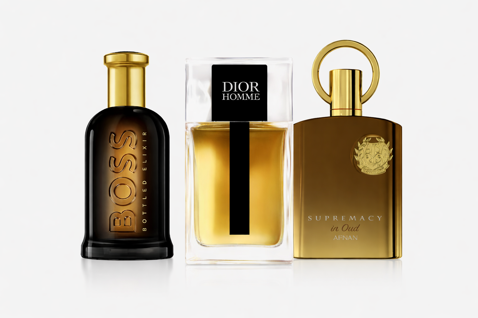 Afnan Supremacy Oud steht für markante Tiefe und Charakter, Dior Homme Intense für elegante Sinnlichkeit und Hugo Boss Bottled Elixir für moderne Würze und Vielseitigkeit.