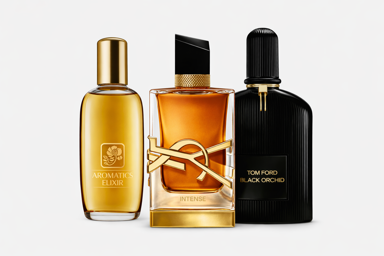 Clinique Aromatics Elixir steht für Tiefe und klassische Eleganz. YSL Libre Intense bringt warme Sinnlichkeit und moderne Stärke, während Tom Ford Black Orchid mit dunkler Opulenz und verführerischer Intensität abrundet.